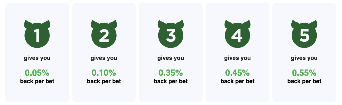 The casino offers a percentage of each bet you place, regardless of the outcome. Start playing any of the games and you will notice real money starts flowing into your Piggy Bank. Each game contributes differently to the amount of cashback you will receive. Each game is categorized into five different groups. Games with higher volatility and bet sizes belong to higher numbers such as 5 and 4 and will provide more cashback. Games with lower bet sizes fall into lower number categories such as 1, 2 and 3. You can collect as much as funds inside your Piggy Bank without worrying about the wagering requirement. Once you have collected the desired amount, you can convert the cashback into real cash.Â