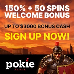 Here, at Pokie Place Casino, you get 50 free spins without any deposit! Get your free chances now and win up to $200 as a no deposit bonus! This is only a starter, as every new player also gets 150% up to $3,000 and 150 free spins on your first three deposits!